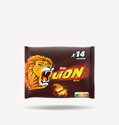 Ετοιμάσου για ένα δυνατό, απολαυστικό δάγκωμα με το NESTLE LION®: Τραγανές γκοφρέτες γεμιστές με λαχταριστή καραμέλα, καλυμμένες με τραγανά δημητριακά, με επικάλυψη από πλούσια σοκολάτα γάλακτος. Μοιάζει άγριο; Είναι απολαυστικό.