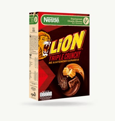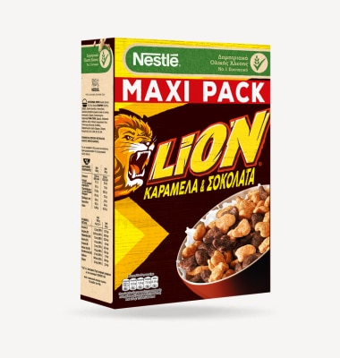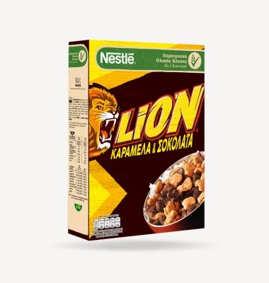 Τραγανές νιφάδες δημητριακών LION® με τον απίθανο συνδυασμό σοκολάτας και καραμέλας για το πιο δυνατό πρωινό ξεκίνημα. Κάθε κουταλιά περιέχει 7 βιταμίνες, Ασβέστιο, Σίδηρο και όλα τα οφέλη της ολικής άλεσης!